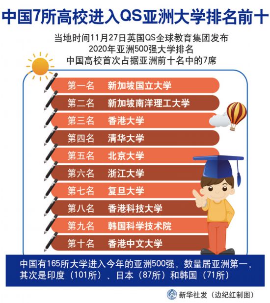 新華社倫敦11月27日電(記者金晶 張家偉)英國QS全球教育集團27日發布2020年亞洲500強大學排名,中國高校首次占據亞洲前十名中的7席.