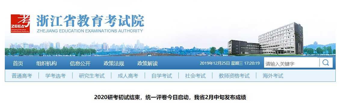 浙江省教育考試院公布的“2020研考初試結束,統一評卷今日啟動,我省2月中旬發布成績”可得知,本次考試成績預計將于2020年2月中旬發布。