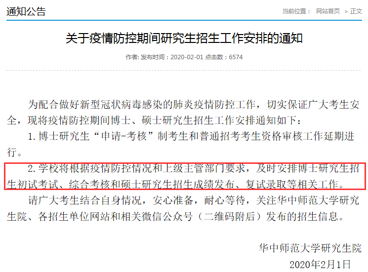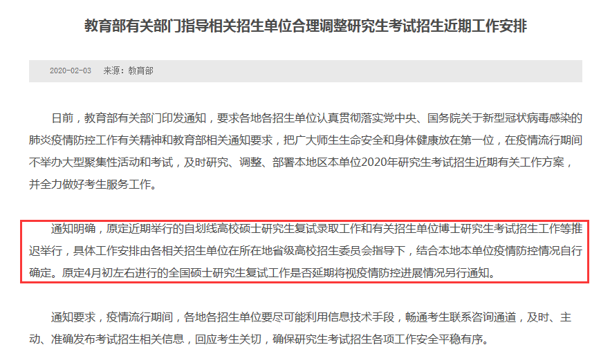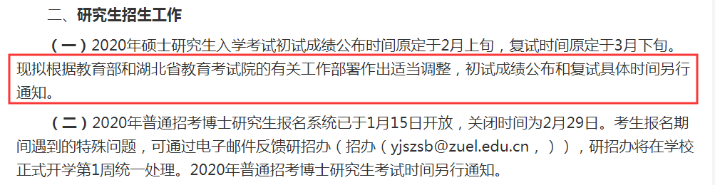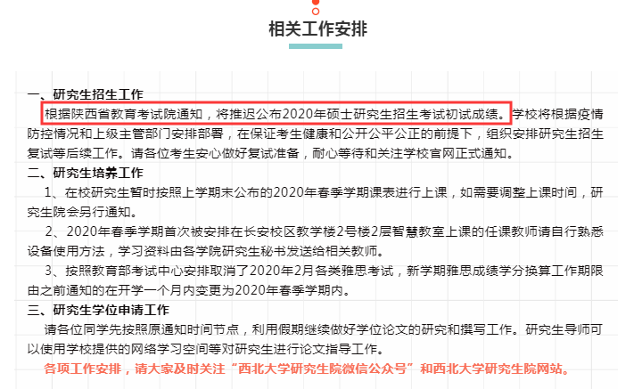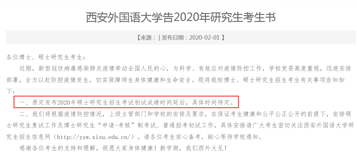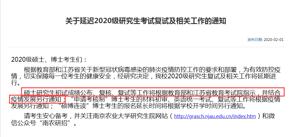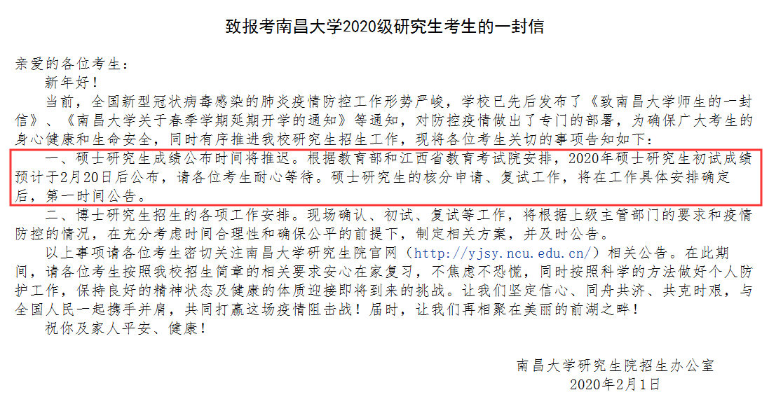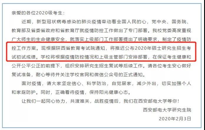 延后初試成績(jī)公布,成績(jī)復(fù)核以及復(fù)試相關(guān)工作。具體時(shí)間另行通知。