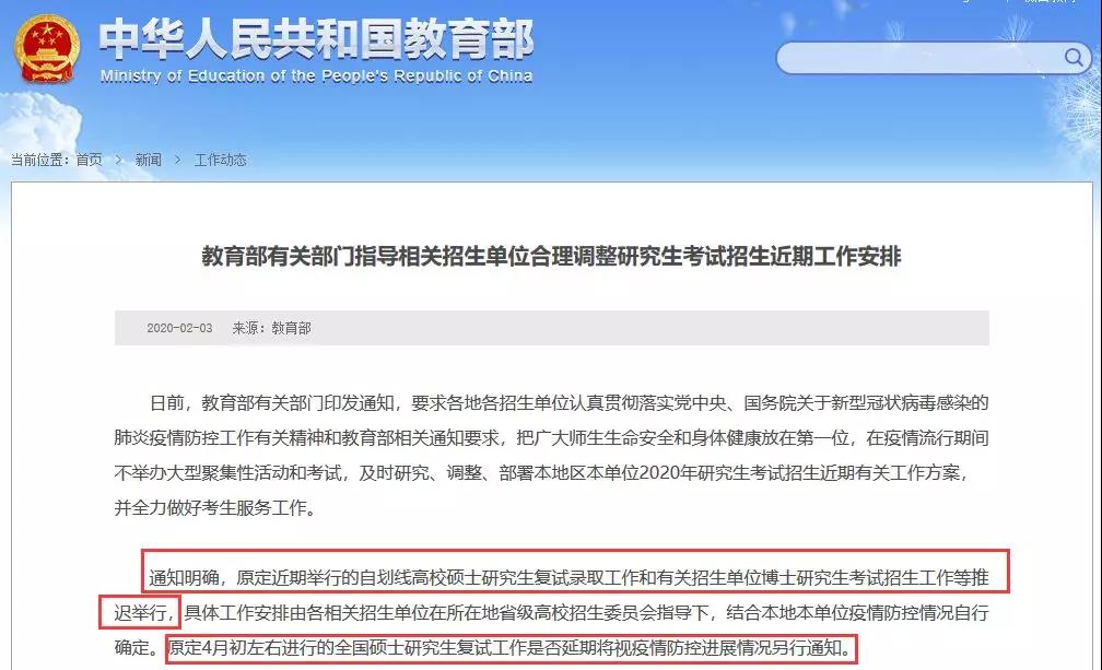 通知明確,原定近期舉行的自劃線高校碩士研究生復試錄取工作和有關招生單位博士研究生考試招生工作等推遲舉行,具體工作安排由各相關招生單位在所在地省級高校招生委員會指導下,結合本地本單位疫情防控情況自行確定。原定4月初左右進行的全國碩士研究生復試工作是否延期將視疫情防控進展情況另行通知。
