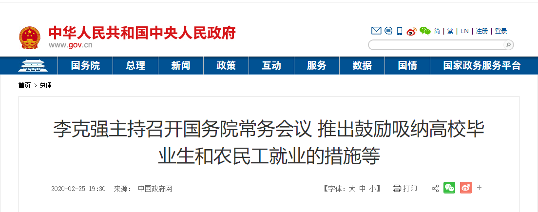 國務院總理李克強2月25日主持召開國務院常務會議,推出鼓勵吸納高校畢業生和農民工就業的措施;確定鼓勵金融機構對中小微企業貸款給予臨時性延期還本付息安排,并新增優惠利率貸款;部署對個體工商戶加大扶持,幫助緩解疫情影響紓困解難。
