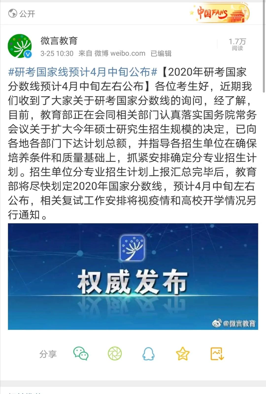 對于2020年考研的同學們來說,無數次在微博中搜索“國家線公布時間”、“2020年國家線”的你們,翻看數篇推測“國家線”文章的你們,終于在3月末迎來了曙光。微言教育官方微博在3月25日上午公布國家線發布時間為4月中旬左右,還有不到一個月的時間考生們就要面對復試、調劑、二戰或者工作的抉擇,無論是哪種結果,親愛的你都會前程似錦,因為“星光不負趕路人!”