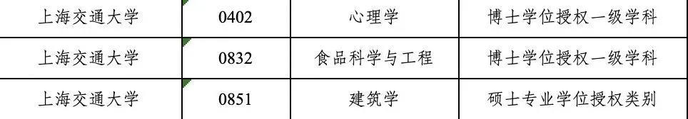 交大作為全國首批學(xué)位授權(quán)自主審核高校,增列3個學(xué)位授權(quán)點:心理學(xué)博士學(xué)位授權(quán)一級學(xué)科、食品科學(xué)與工程博士學(xué)位授權(quán)一級學(xué)科、建筑學(xué)碩士專業(yè)學(xué)位授權(quán)類別。