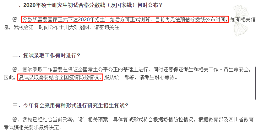 突如其來的新冠病毒疫情打亂了全盤計劃,針對目前的形式,必要時需放棄面對面的考查形式,加大初始權(quán)重實(shí)行遠(yuǎn)程復(fù)試。如若采取網(wǎng)絡(luò)復(fù)試,碩士新生入學(xué)后還要進(jìn)行一場筆試。面試過程要全程錄音、錄像,并將在新生入學(xué)時進(jìn)行核對,一旦發(fā)現(xiàn)作弊或者筆試不合格現(xiàn)象,立即取消錄取資格。