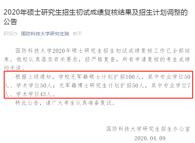國防科技大學研究生院發布公告提到,2020年碩士研究生初試成績復核工作已全部結束,根據上級通知,學校無軍籍碩士計劃擴招100人,其中專業和學術學位各50人。
