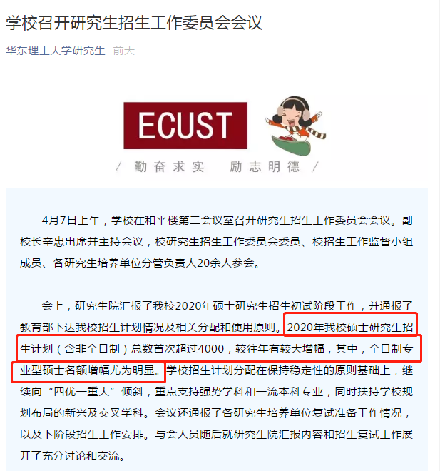 4月7日上午,華東理工大學在和平樓第二會議室召開研究生招生工作委員會會議。會上提出,2020年我校碩士研究生招生計劃(含非全日制)總數首次超過4000,較往年有較大增幅,其中,全日制專業型碩士名額增幅尤為明顯。