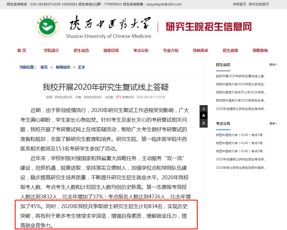 陜西中醫藥大學開展2020年研究生復試線上答疑,2020年該校共爭取碩士研究生招生計劃834名,實現歷史突破,將有利于更多考生繼續求學深造,增強自身素質,緩解就業壓力,提高就業競爭力。