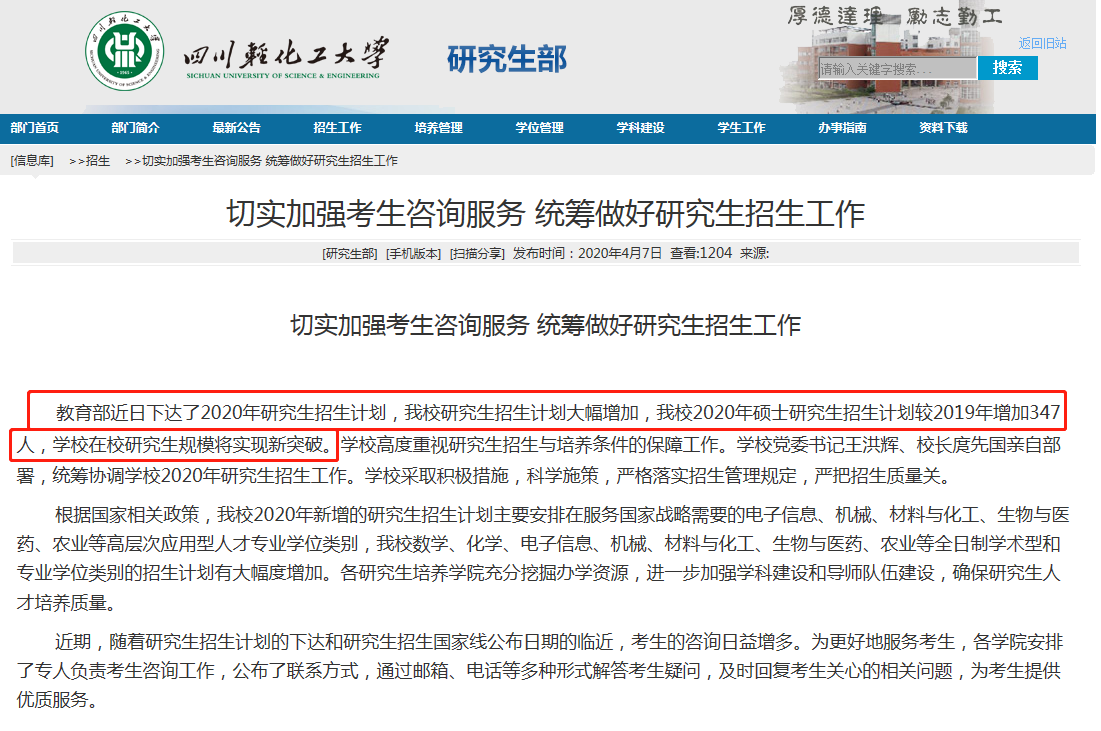 四川輕化工大學發布公告,表示教育部近日下達了2020年研究生招生計劃,該校研究生招生計劃大幅增加,該校2020年碩士研究生招生計劃較2019年增加347人,學校在校研究生規模將實現新突破。