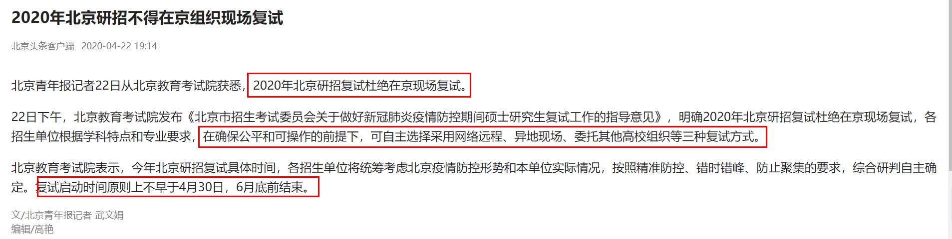 22日下午,北京教育考試院發布《北京市招生考試委員會關于做好新冠肺炎疫情防控期間碩士研究生復試工作的指導意見》,明確2020年北京研招復試杜絕在京現場復試,各招生單位根據學科特點和專業要求,在確保公平和可操作的前提下,可自主選擇采用網絡遠程、異地現場、委托其他高校組織等三種復試方式。