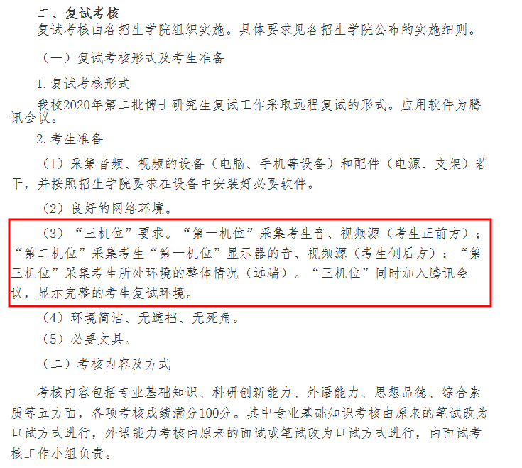 不少同學發(fā)現(xiàn),東北農(nóng)業(yè)大學近期發(fā)布了博士生復試考核的通知,提到了“三機位”網(wǎng)絡(luò)復試方案。要求“三機位”同時加入騰訊會議,顯示完整考生復試環(huán)境。這個方案也可能會用到碩士研究生復試環(huán)節(jié)中。