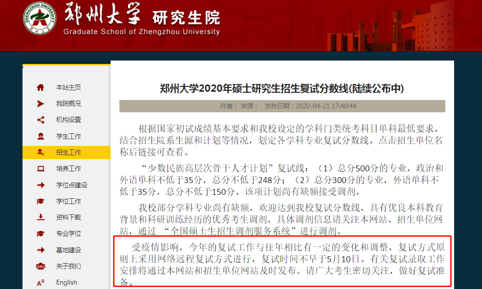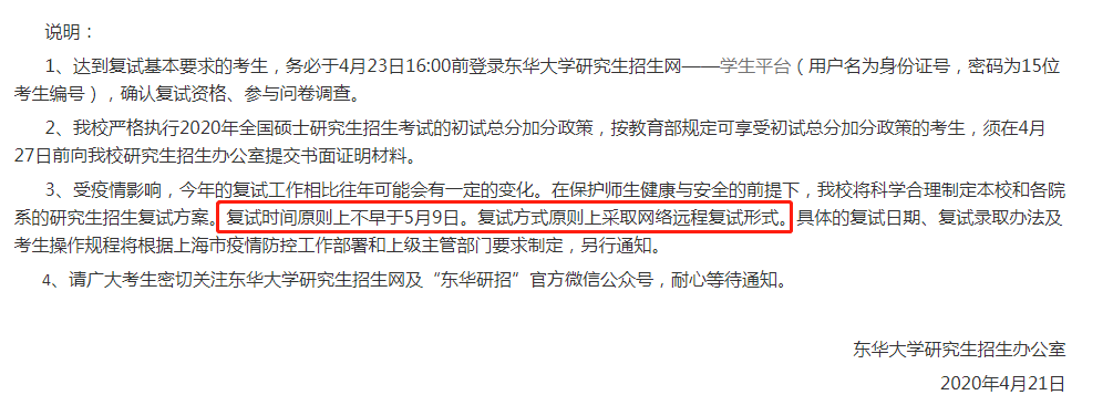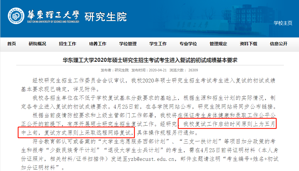 經(jīng)研究,該校復試工作啟動時間原則上為五月中上旬,復試方式原則上采取遠程網(wǎng)絡(luò)復試,具體操作規(guī)程另行通知。