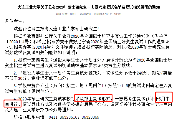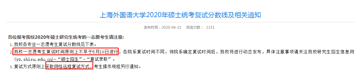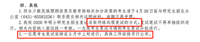 該校一志愿考生復試時間原則上不早于5月10日進行,復試方式原則上采取網(wǎng)絡(luò)遠程復試方式,考生操作規(guī)程另行通知。