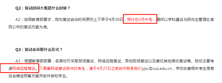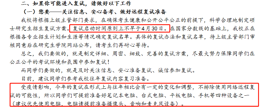 受疫情影響,今年的復試工作相比往年可能會有一定的變化。在保護師生健康與安全的前提下,該校將科學合理制定本校和各院系的研究生招生復試方案。復試時間原則上不早于5月9日。復試方式原則上采取網(wǎng)絡(luò)遠程復試形式。