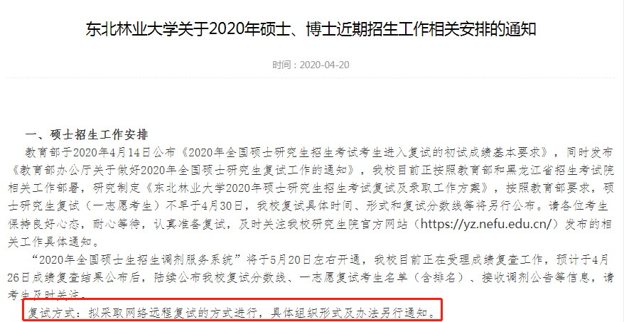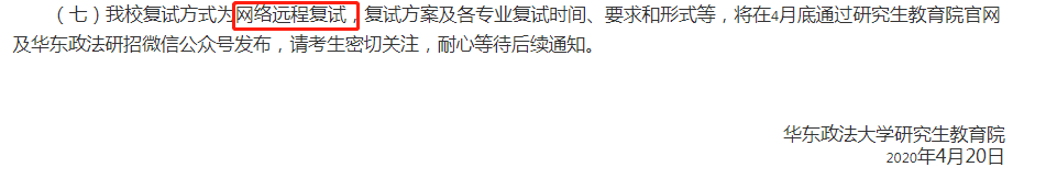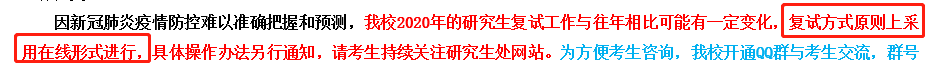 因新冠肺炎疫情防控難以準確把握和預測,該校2020年的研究生復試工作與往年相比可能有一定變化,復試方式原則上采用在線形式進行,具體操作辦法另行通知,請考生持續(xù)關(guān)注研究生處網(wǎng)站。