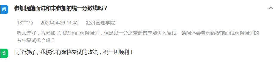 問:老師您好,我參加了北航提面獲得通過,但是以一分之差遺憾未能進入復試。請問還會考慮給提前面試獲得通過的考生復試機會嗎?