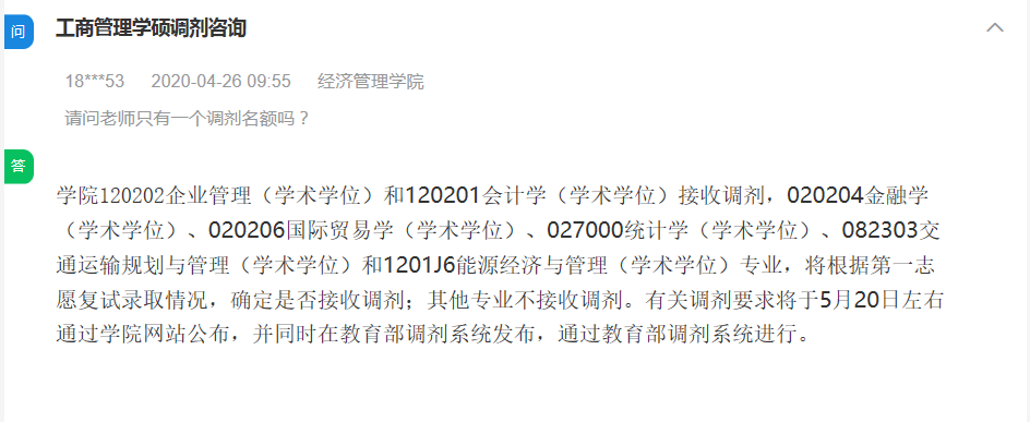 回答:學院120202企業管理(學術學位)和120201會計學(學術學位)接收調劑,020204金融學(學術學位)、020206國際貿易學(學術學位)、027000統計學(學術學位)、082303交通運輸規劃與管理(學術學位)和1201J6能源經濟與管理(學術學位)專業,將根據第一志愿復試錄取情況,確定是否接收調劑;其他專業不接收調劑。有關調劑要求將于5月20日左右通過學院網站公布,并同時在教育部調劑系統發布,通過教育部調劑系統進行。