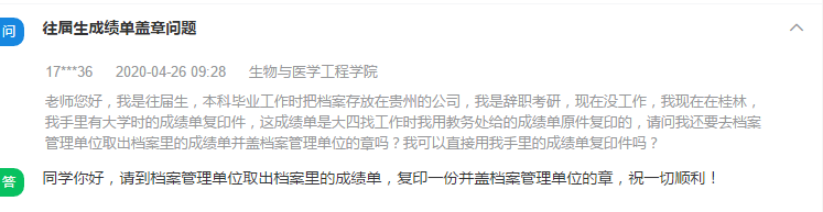 問:老師您好,我是往屆生,本科畢業工作時把檔案存放在貴州的公司,我是辭職考研,現在沒工作,我現在在桂林,我手里有大學時的成績單復印件,這成績單是大四找工作時我用教務處給的成績單原件復印的,請問我還要去檔案管理單位取出檔案里的成績單并蓋檔案管理單位的章嗎?我可以直接用我手里的成績單復印件嗎?