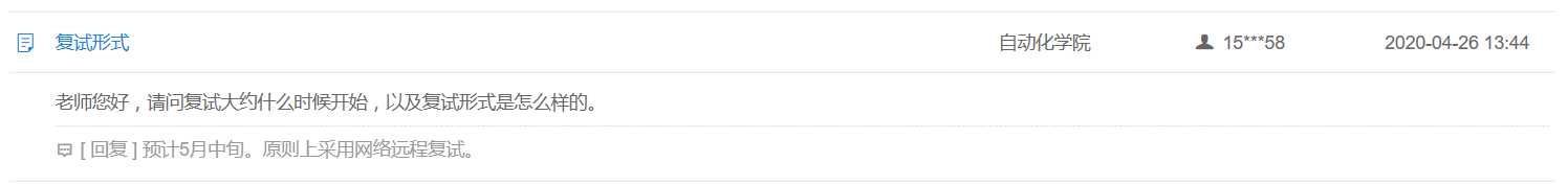回答:預(yù)計(jì)5月中旬。原則上采用網(wǎng)絡(luò)遠(yuǎn)程復(fù)試。