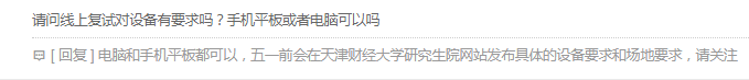 答:電腦和手機平板都可以,五一前會在天津財經大學研究生院網站發布具體的設備要求和場地要求,請關注