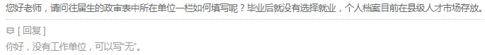 問:您好老師,請問往屆生的政審表中所在單位一欄如何填寫呢?畢業后就沒有選擇就業,個人檔案目前在縣級人才市場存放。