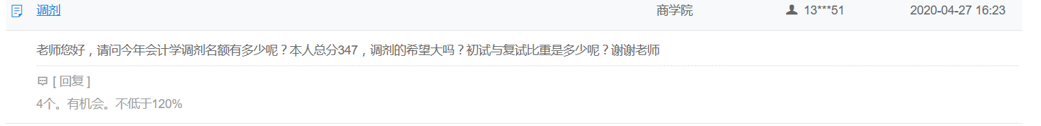 問:老師您好,請問今年會計學調(diào)劑名額有多少呢?本人總分347,調(diào)劑的希望大嗎?初試與復試比重是多少呢?謝謝老師