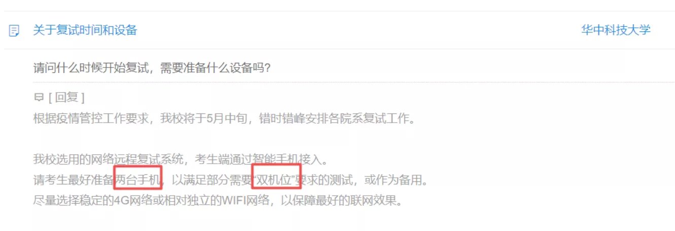 華中科技大學(xué):請(qǐng)考生最好準(zhǔn)備兩臺(tái)手機(jī),以滿足部分需要“雙機(jī)位”要求的測(cè)試,或作為備用。