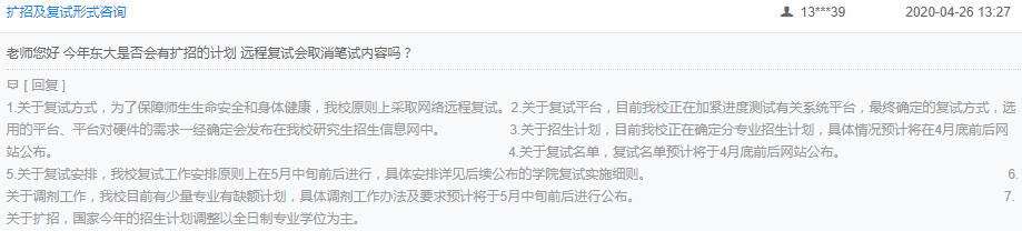 問:老師您好 今年東大是否會有擴(kuò)招的計(jì)劃 遠(yuǎn)程復(fù)試會取消筆試內(nèi)容嗎?
