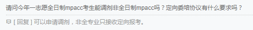 問(wèn):請(qǐng)問(wèn)今年一志愿全日制mpacc考生能調(diào)劑非全日制mpacc嗎?定向委培協(xié)議有什么要求嗎?