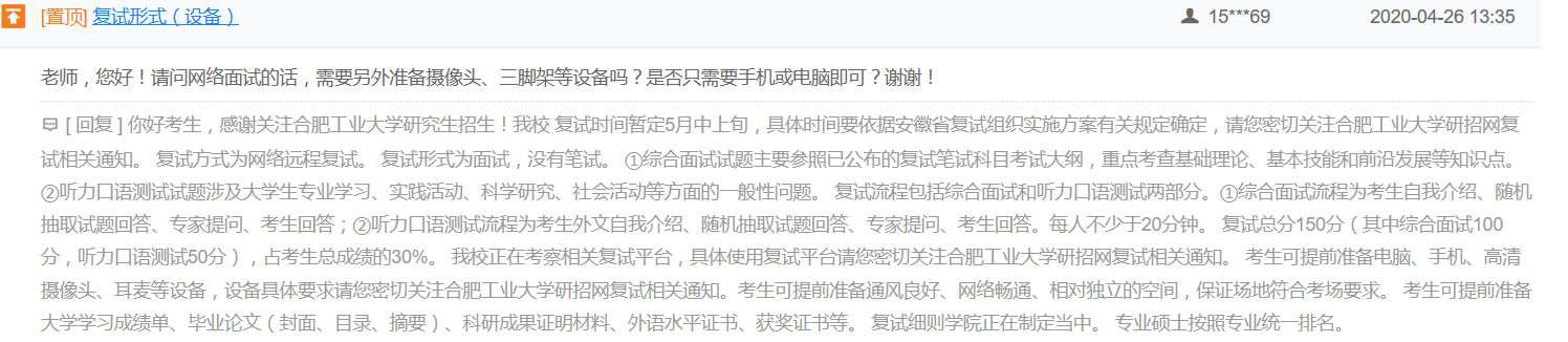 負責人:考慮到目前我市新冠肺炎疫情防控的總體情況和要求,北京地區(qū)現階段不宜組織現場復試。各單位根據學科特點和專業(yè)要求,在確保公平和可操作性的前提下,可采用網絡遠程、異地現場以及委托其他高校組織等三種復試形式,具體方式由各招生單位自主確定。