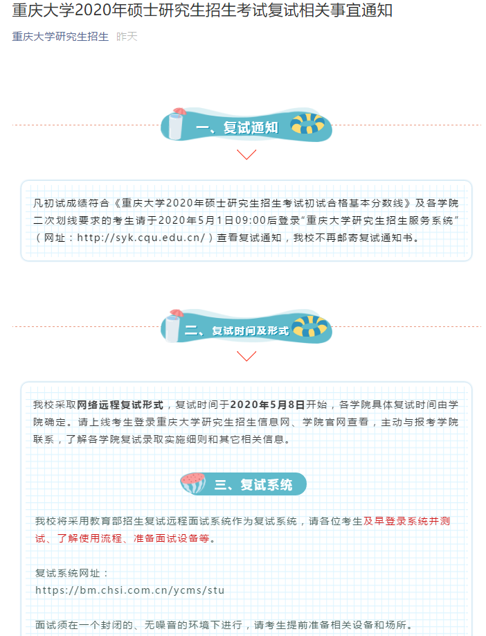 除了北京地區(qū)之外,重慶大學也明確表示自己將采取網絡復試方法,并提供了網絡復試鏈接。