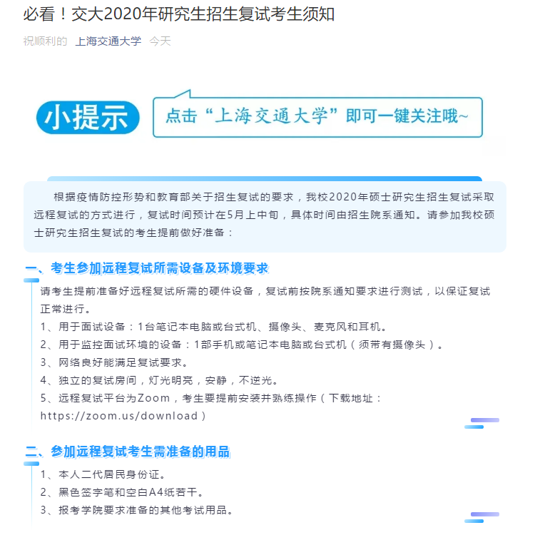 上海交通大學指出將使用zoom作為網絡復試平臺,要求考生具備電腦或者手機設備,在光線充足、環(huán)境安靜的地方進行網絡復試。