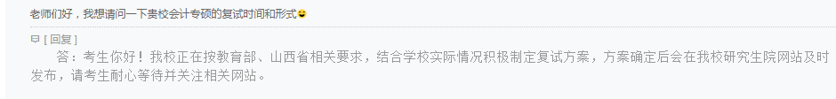 答:考生你好!我校正在按教育部、山西省相關要求,結合學校實際情況積極制定復試方案,擬采用網絡遠程復試。方案確定后會在我校研究生院網站及時發布,請考生耐心等待并關注相關網站。