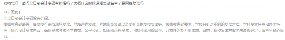 問(wèn):老師您好,請(qǐng)問(wèn)全日制會(huì)計(jì)專(zhuān)碩有擴(kuò)招嗎?大概什么時(shí)候通知復(fù)試名單?是網(wǎng)絡(luò)復(fù)試嗎