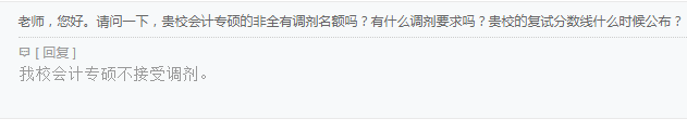 問(wèn):老師,您好。請(qǐng)問(wèn)一下,貴校會(huì)計(jì)專(zhuān)碩的非全有調(diào)劑名額嗎?有什么調(diào)劑要求嗎?貴校的復(fù)試分?jǐn)?shù)線什么時(shí)候公布?