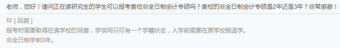 問(wèn):老師,您好!請(qǐng)問(wèn)正在讀研究生的學(xué)生可以報(bào)考貴校非全日制會(huì)計(jì)專(zhuān)碩嗎?貴校的非全日制會(huì)計(jì)專(zhuān)碩是2年還是3年?非常感謝!