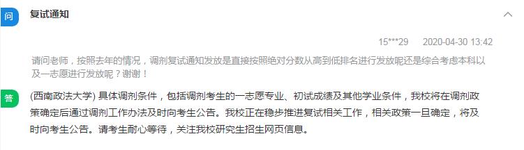 (西南政法大學) 具體調劑條件,包括調劑考生的一志愿專業、初試成績及其他學業條件,我校將在調劑政策確定后通過調劑工作辦法及時向考生公告。我校正在穩步推進復試相關工作,相關政策一旦確定,將及時向考生公告。請考生耐心等待,關注我校研究生招生網頁信息。