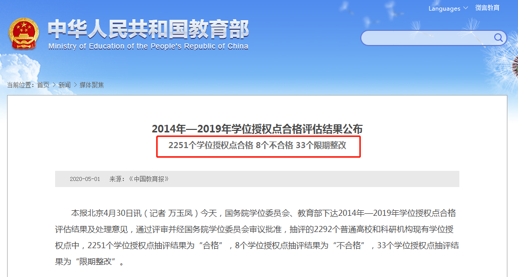 2019年4月,國務院學位委員會、教育部啟動了學位授權點合格評估抽評工作,對自評結果為“合格”的學位授權點按一定比例進行抽評。抽評的2292個普通高校和科研機構現有學位授權點中,2251個學位授權點抽評結果為“合格”,8個學位授權點抽評結果為“不合格”,33個學位授權點抽評結果為“限期整改”。