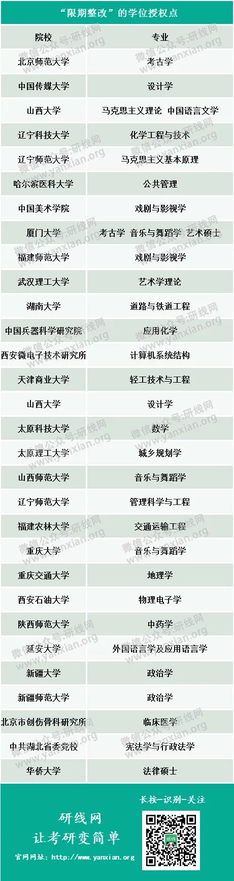 抽評結果為“限期整改”的學位授權點,自發文之日起進行為期2年的整改,2020年招生工作結束后暫停招生,整改結束后接受復評。這些學位授權點如下: