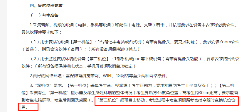 中國人民大學信息學院、歷史學院等學院要求,第二機位強調必須是可移動的。主機位跟上海交大、北京航空航天大學等大多數院校一樣,要求是電腦。第二機位則可以是手機或pad等平板設備。