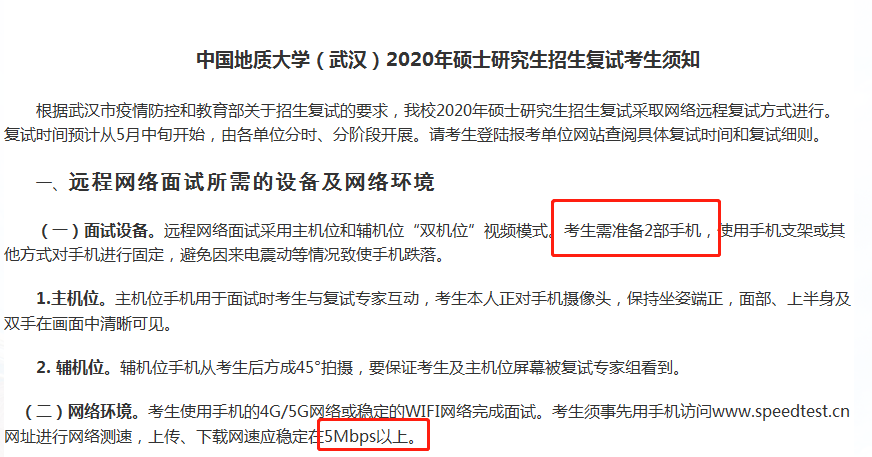 還有一些高校,比如中國地質大學(武漢)、武漢理工大學,要求雙機位都必須使用手機,并且規定了上傳、下載網速應穩定在5Mbps以上。同學們一定要注意院校的具體復試要求。