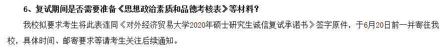 4.《思想政治素質和品德考核表》等材料與連同《對外經濟貿易大學2020年碩士研究生誠信復試承諾書》簽字原件,于6月20日前一并寄往我校。