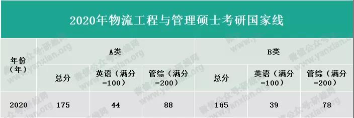 2020年物流工程與管理國家線A區為175分,B區為165分。