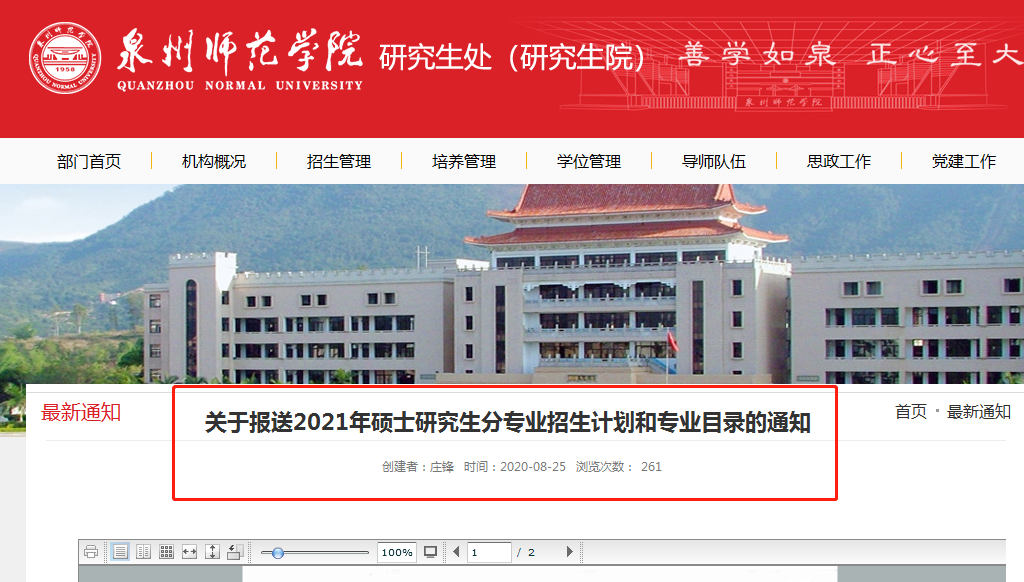 泉州師范大學(xué)發(fā)布《關(guān)于報(bào)送2021年碩士研究生分專業(yè)招生計(jì)劃和專業(yè)目錄的通知》。