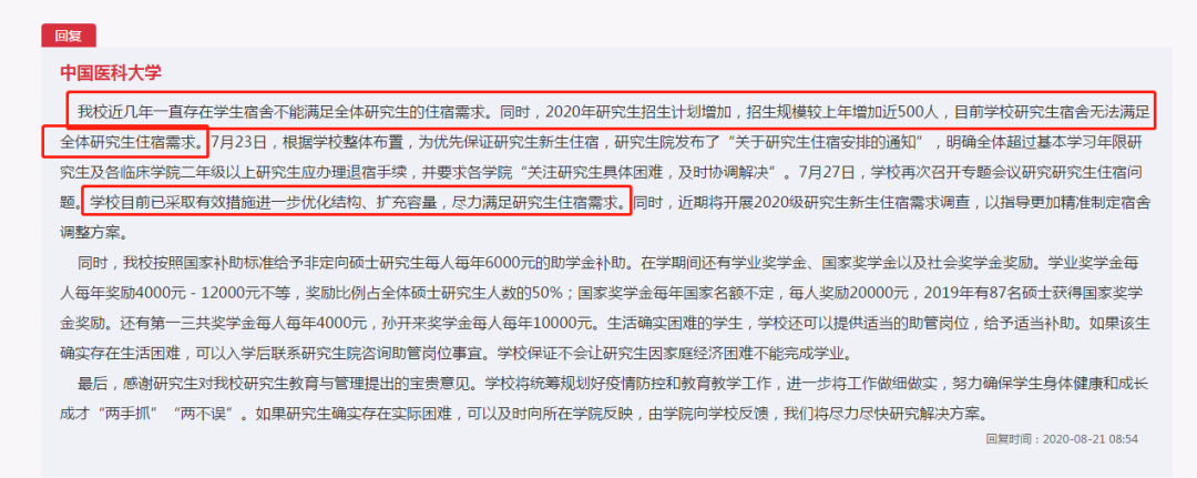 中國醫(yī)科大學(xué)的研究生新生在人民網(wǎng)領(lǐng)導(dǎo)留言板反映由于宿舍緊張,僅給全日制臨床醫(yī)學(xué)學(xué)碩提供一年住宿,該同學(xué)表示家庭經(jīng)濟(jì)原因,無力承擔(dān),有可能放棄入學(xué)的機(jī)會。校方相關(guān)負(fù)責(zé)人對這個(gè)問題進(jìn)行了回答: