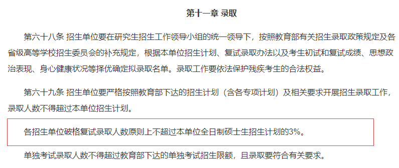 各招生單位破格復(fù)試錄取人數(shù)原則上不超過本單位碩士生招生計(jì)劃的3%。