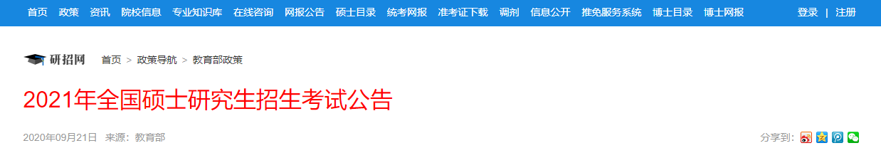 研招網發布:2021年全國碩士研究生招生考試公告