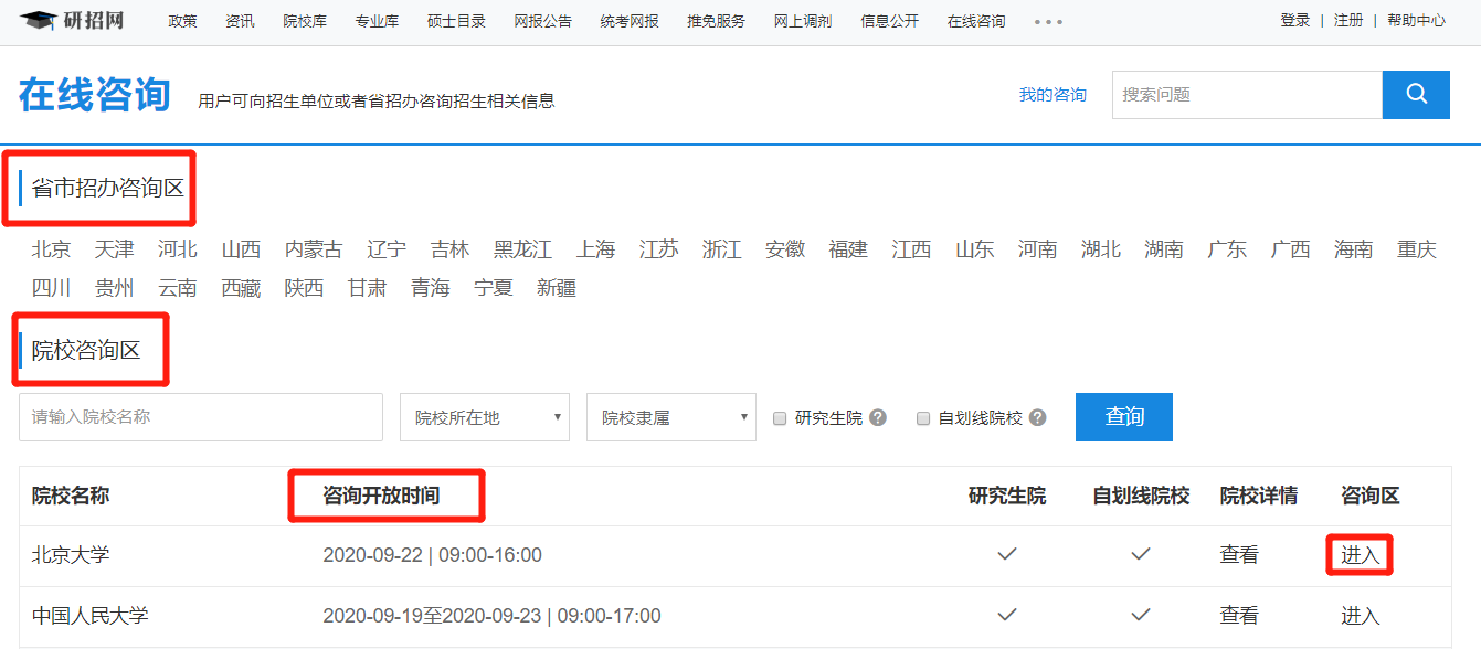 2、根據需求選擇“各省市招辦”或“院校”進行網上咨詢。