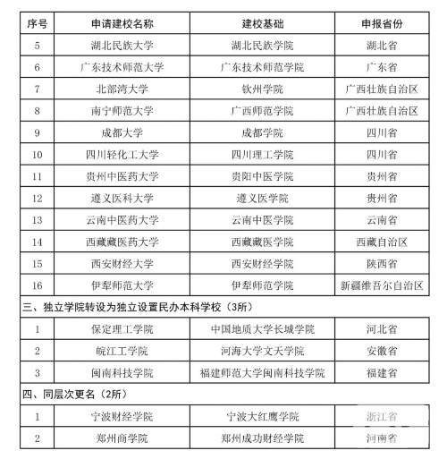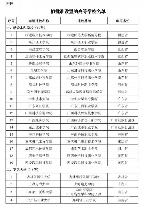 教育部擬批準(zhǔn)設(shè)置的高校名單如下: