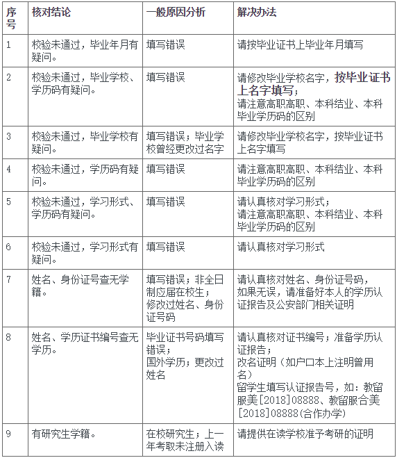 溫馨提示:全體考生可通過登錄研招網自行查看學歷(學籍)校驗結果。校驗結果如提示錯誤可對照下表查詢解決方辦法。
