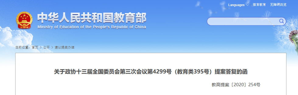 關于政協十三屆全國委員會第三次會議第4299號(教育類395號)提案答復的函教高提案〔2020〕254號